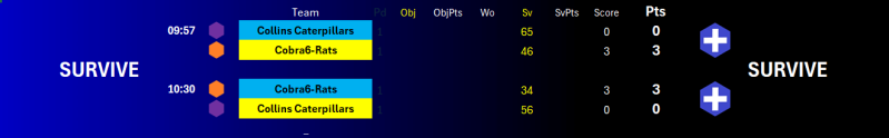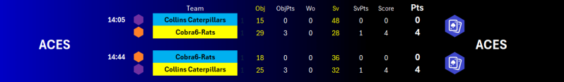 The Caterpillars manage one of their game wins, but (perhaps) concentrating on the objectives meant that Cobra 6 were able to keep their death count low and they gained one Survive League Point, despite losing the game.