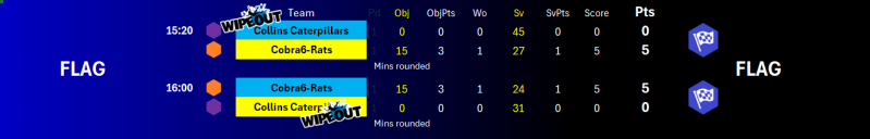 As you can see from the Headline graphic above - it was (to say the least) a victory for Cobra6-Rats. This didn't come as a great shock to everyone on the day, because the teams were spliced together from willing players to test game modes etc - and the Caterpillars had a collection of regulars and new players. Thank you to EVERYONE for bearing with us on this.